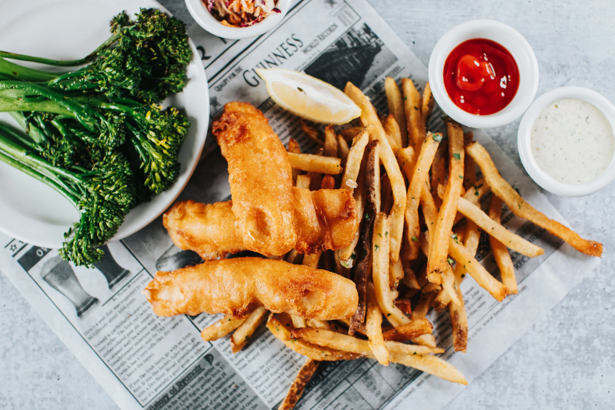 Crispy Battered Cod, Hand Cut fries, House Slaw, Tartar Sauce